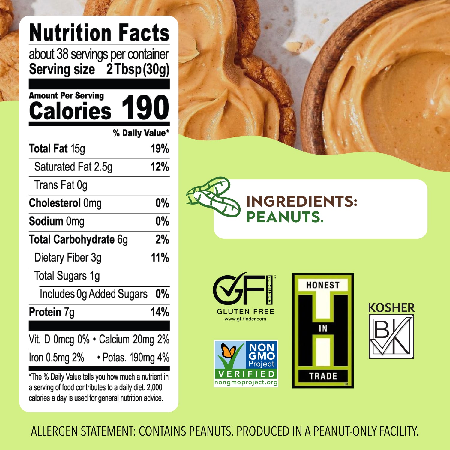 Deliciously creamy, natural peanut butter with just one ingredient - peanuts! Comes in a large 2.5 pound (40 ounce) jar so you won't run out as quickly, plus it makes scooping easier for baking, smoothies and recipes. Unsweetened and salt-free.